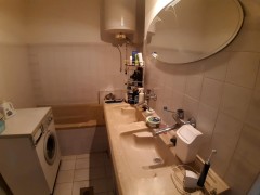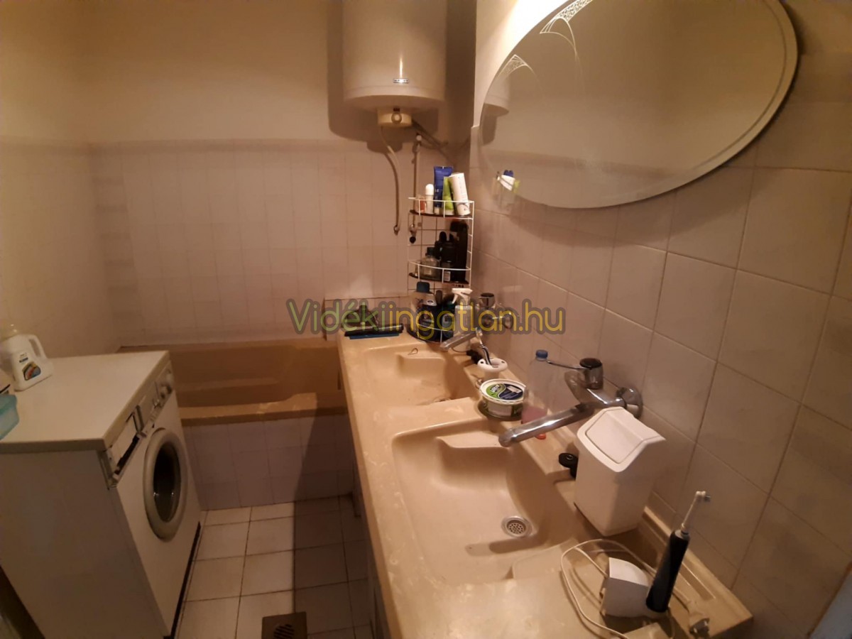 Fürdőszoba amely fürdőkádas, dupla mosdós és egy külön nyíló wc.