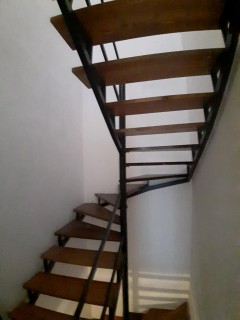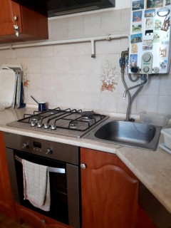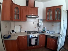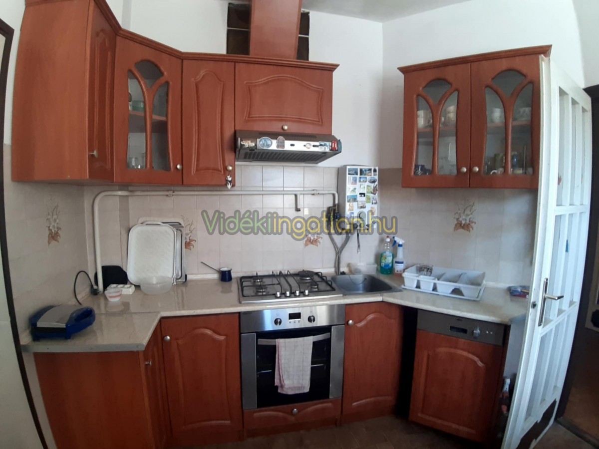 Földszinten egy konyha + étkező egyben, beépített konyhabútorral és egy kamra.